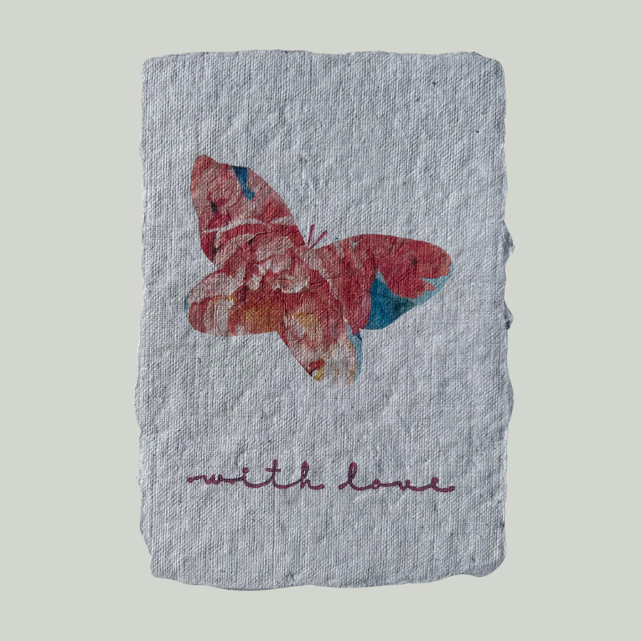 Met aandacht gemaakt van handgeschept papier. De natuurlijke vezels en ruwe randen maken elke geschepte kaart uniek. Deze kaart is niet zomaar papier, het is een klein kunstwerkje dat je met liefde geeft. Een puur en persoonlijk gebaar voor elke gelegenheid.