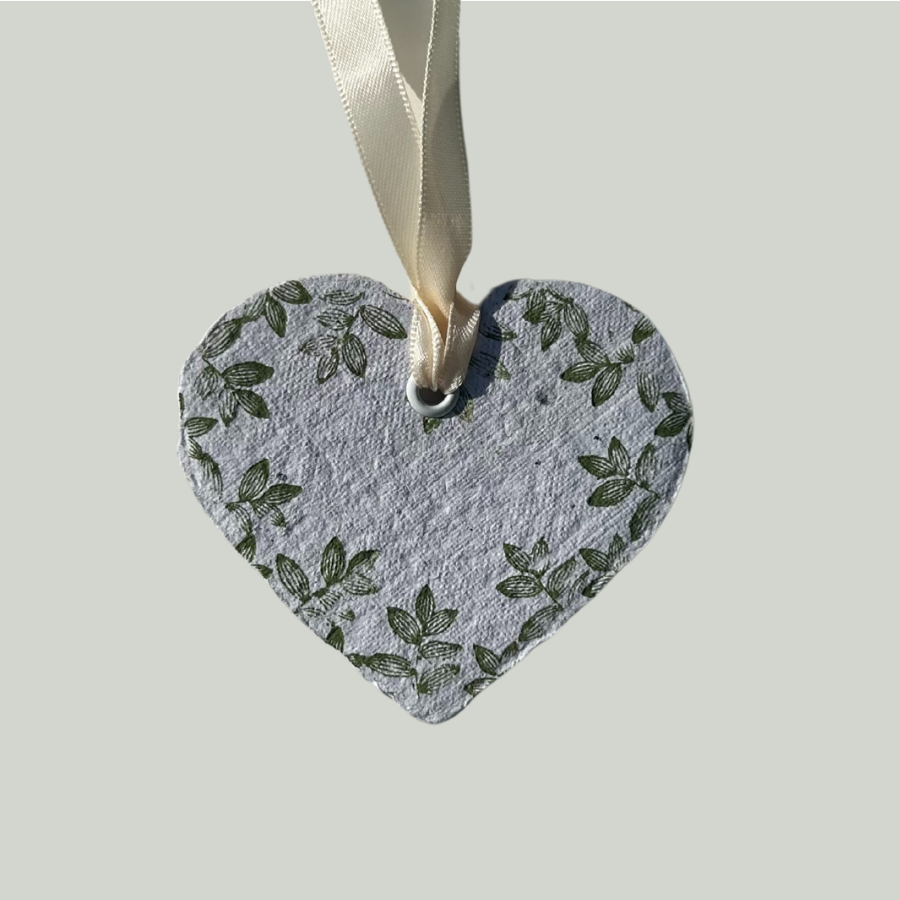 - Van dit hartje zijn meerdere soortgelijke exemplaren op voorraad, allemaal met dezelfde handgestempelde afbeelding. Elke exemplaar is uniek door het handgemaakte karakter.